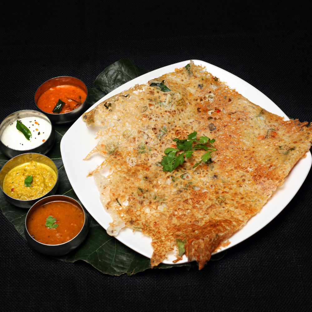 An ultra-thin, crispy dosa cooked to perfection with an optional drizzle of aromatic ghee. This light and crunchy crepe is paired with sambhar and three traditional chutneys for a delightful experience.